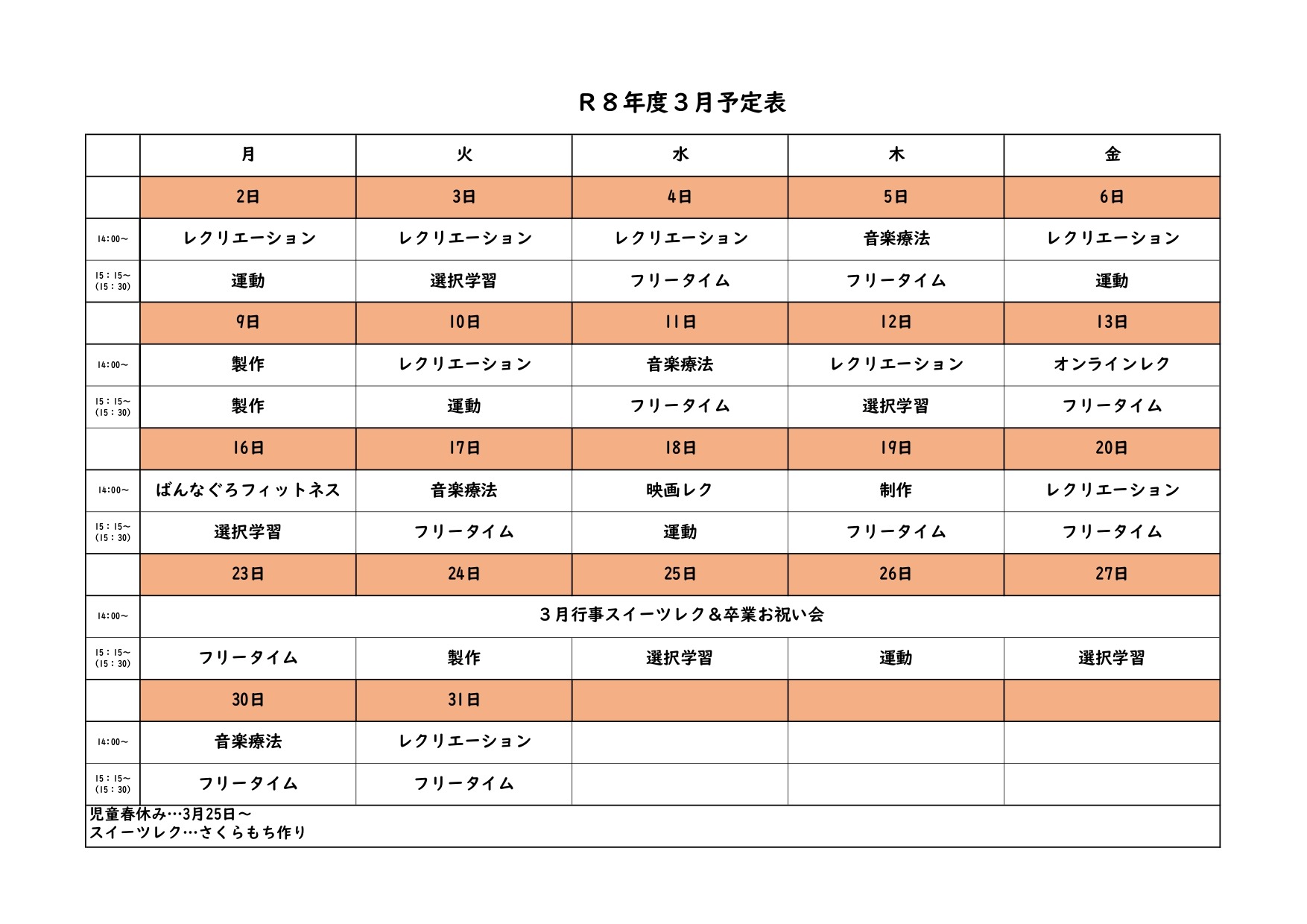 3月23日~3月27日の1週間 スイーツレクと卒業お祝い会を予定しております。